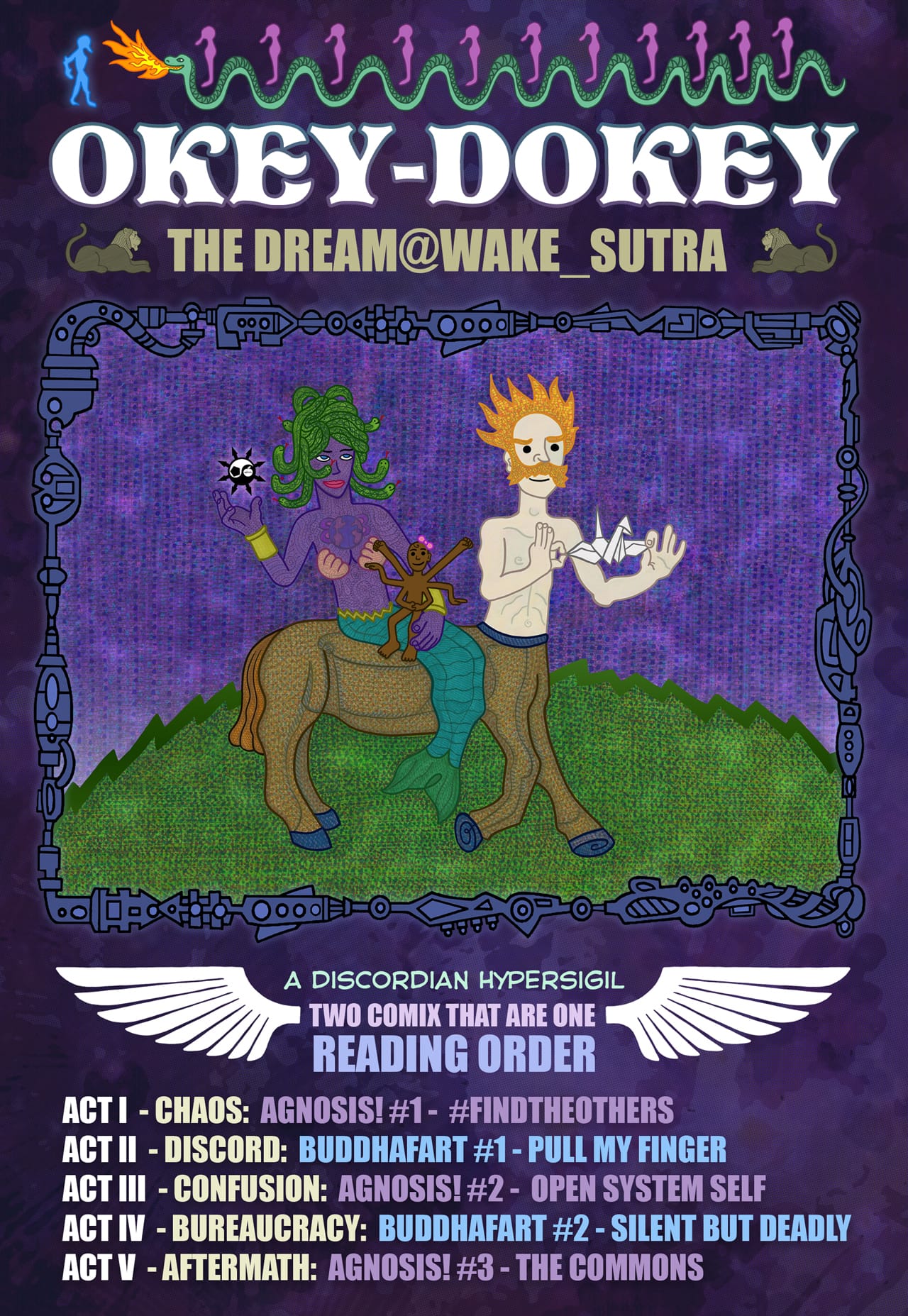 OKEY-DOKEY is the forthcoming meta-modern graphic novel by Bobby Campbell, Marcelino Balao III, and Todd Purse. Featuring two intertwined comic book adventures, Agnosis! & BUDDHAFART, which weave together to form the Dream@wake_Sutra, a Discordian Hypersigil that tells the tale of the tribe as a SUN PLAY OF THE AGES in five Acts :)))